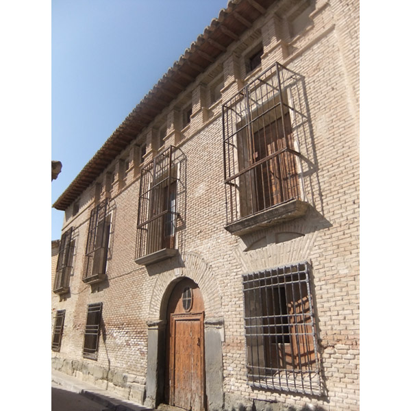 Tiene una bella fachada de ladrillo, que a los clásicos elementos de la arquitectura civil aragonesa incorpora la rejería propia de esta zona de Monegros. En planta baja, flanquean a la sobria portada de medio punto de ladrillo jambeado de piedra dos huecos cuyo dintel es un sardinel de ladrillo más un arco de descarga del mismo material. En la siguiente altura vemos tres grandes huecos con espléndidas rejas de forja que apoyan en peanas de sillería. La galería es de vanos adintelados entre pilastras y con doble línea de impostas, bajo el alero de canes decorados.